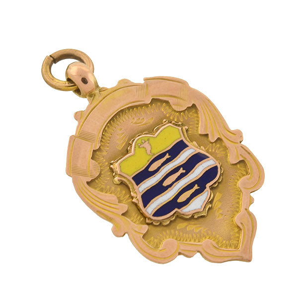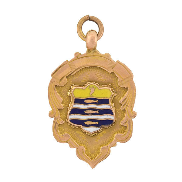 A wonderful enameled achievement badge?from the Art Deco?(ca1925) era! This decorative medallion pendant?is crafted in 9kt?gold, and is of English origin.?The medal is?shield-shaped, with a colorful yellow, blue, and white enameled center. Fine etched details surround the enameled shield, which bears a nautical fish motif.?Several English hallmarks are stamped on the back of the piece, including the gold purity marks 9 375 and the maker's initials TF?(Thomas Fattorini of Fattorini & Sons- a maker of sports trophies and awards medals during?the late 19th century). Engraved on the back of the piece is an inscription that reads: WORTHING CHARITY CUP 1925 - 6 WINNERS WORTHING F.C. L. NAIRN.?This collectable awards medallion?hangs from a gold ring at the top, and would look stylish paired with a complimentary chain!