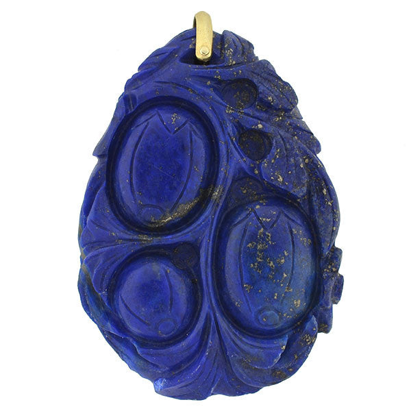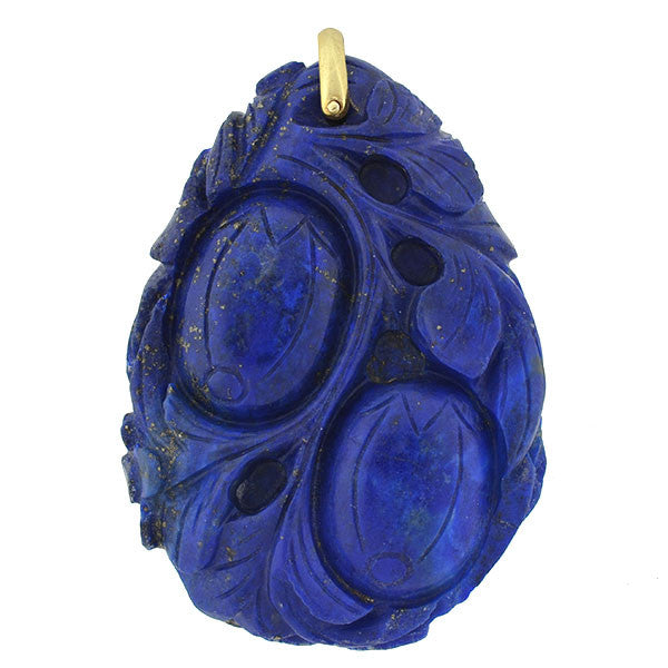 A beautiful lapis pendant?from the Art Deco (ca1920) era! This wonderful hand-carved?piece is of Chinese origin and is rather substantial in size. The lapis forms a large teardrop shape and displays a spectacular deep blue color with shimmery gold flecks. The hand-carved design has a floral motif that gives three-dimensional detail and depth to the piece. At the top of the pendant is a simple yellow gold bail, allowing it to be hung and worn from your favorite chain. A lovely and artistic handmade piece, it would make a striking addition to any collection!