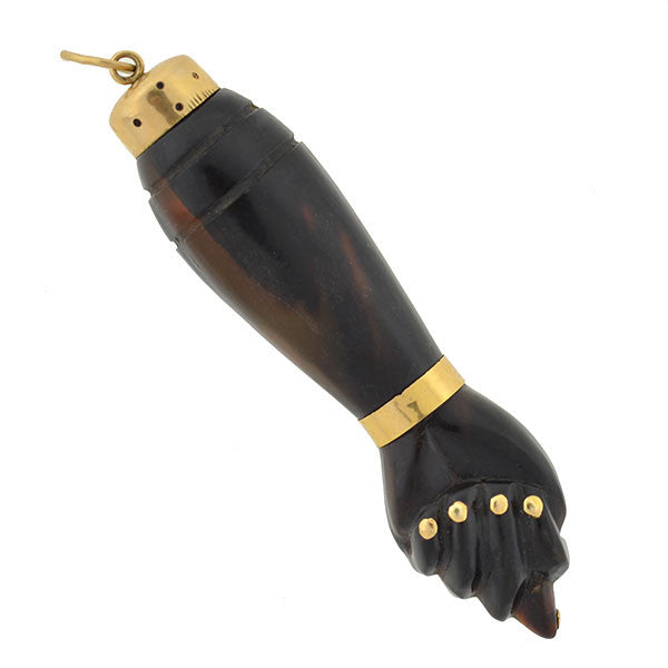 A wonderful and unusual?Figa pendant from the Victorian (ca1880) era! This fantastic?hand-carved piece is made of tortoise shell?(now a banned material, antique tortoise shell jewelry is very collectible) and is detailed with 18kt yellow gold accents. The piece depicts a three dimensional?arm topped with an 18kt yellow gold cap, and encircling the wrist is a gold bangle bracelet. The clenched fist is carved with realistic detail depicting individual fingers, each of which is accented with a gold fingernail. The piece hangs from a simple bail affixed to the gold cap. A fabulous example of the Figa design incorporated into jewelry, it would look perfect hanging from a long gold chain and would make a wonderful addition to any collection!