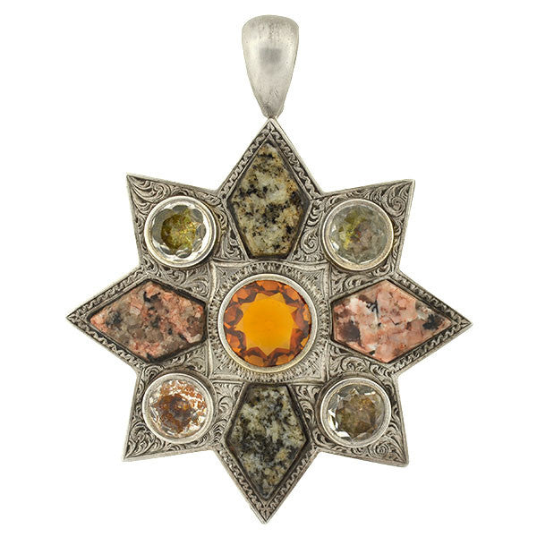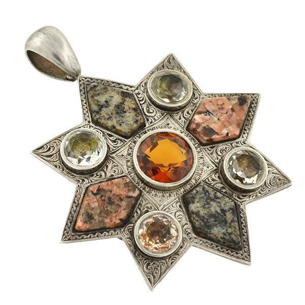 A beautiful and substantial starburst pendant?from the Victorian (ca1880) era! Made of sterling silver, the pendant forms a large 8-point star decorated with a variety of stones. The surface?of the piece?is hand-etched with a flowing scrolled motif, which adds beautiful depth and texture.?A faceted citrine is bezel set at the center of the star, which is rich and lively in color. A pattern of alternating granite and foil-backed paste stones?surround the center stone, decorating each point of the star. The closed-backed stones are faceted and appear?pale gold and champagne in color, thanks to their original foil backings. They are perfectly complimented by the light rusty red and charcoal grey colors of the granite stones. Originally an antique pin, the clasp has been removed and replaced with a fluted sterling bail at the top, perfect for hanging from a favorite Victorian chain.?A very attractive and unusual statement?piece, it would make a special?addition to any collection!