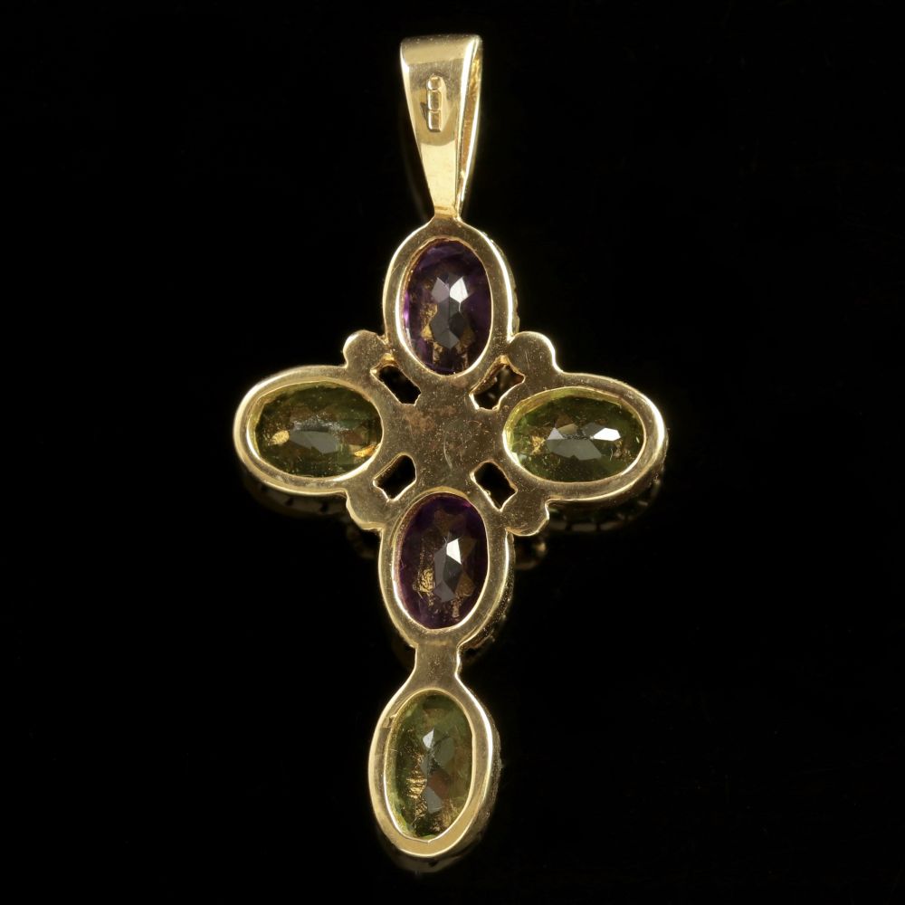 This colourful Suffragette style cross pendant is set with two violet Amethysts and three green Peridots with a white Pearl in the centre.