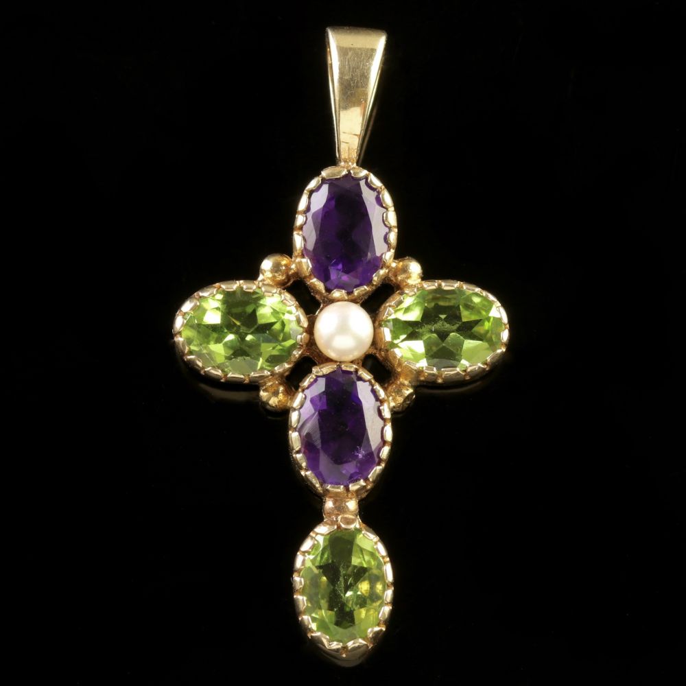 Amethyst Peridot Pearl Suffragette Cross Pendant 9Ct Gold