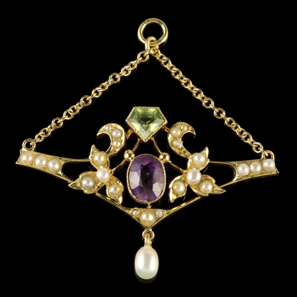This fabulous antique Edwardian 15ct Yellow Gold Suffragette pendant is Circa 1910. The beautiful pendant is adorned with a central violet Amethyst, green Peridot and decorated in cream Pearls with a lovely Pearl dropper.