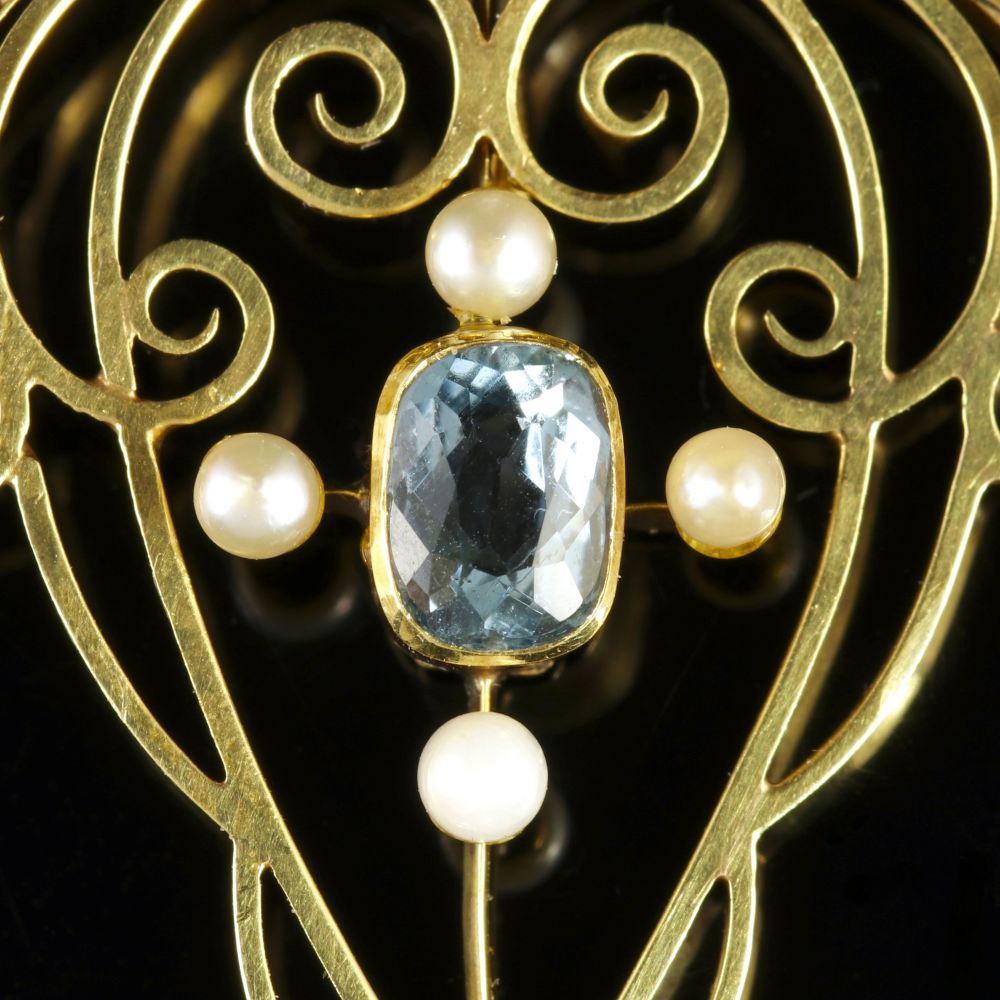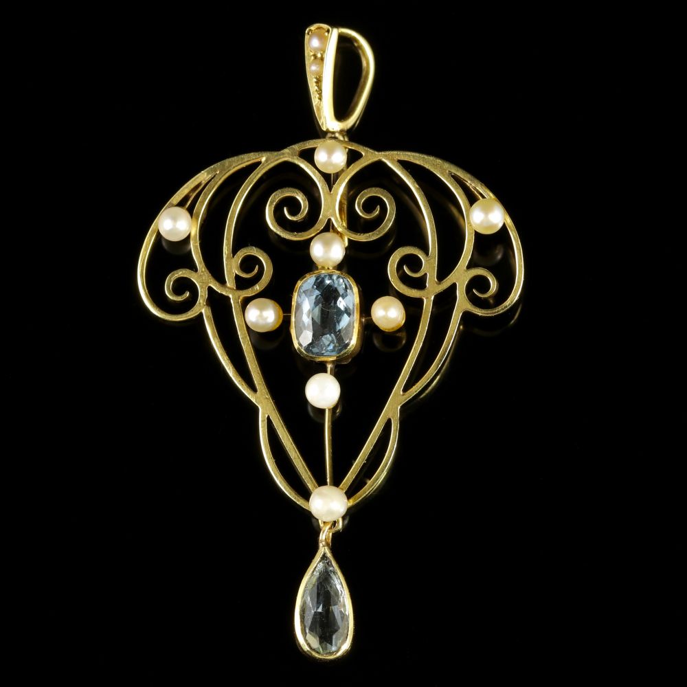 This fabulous Victorian antique 15ct Yellow Gold pendant is adorned with Aquamarines and Pearls.