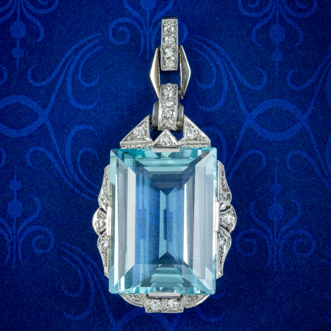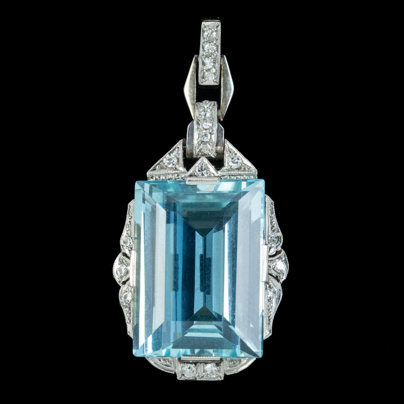 A glamorous 1920s Art Deco pendant built around a magnificent emerald cut aquamarine weighing an impressive 20 carats (approx.) It has a calming blue hue with flickering facets that mimic light reflecting off the surface of a clear pool.