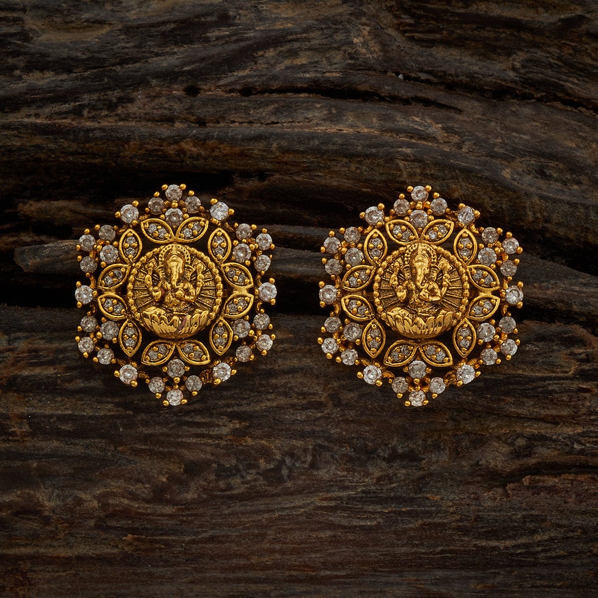Flower Design Antique EarringThese elegantly shaped antique earrings with Lord Ganesha engraved in the middle will add a dash of glitz to your outfit. The pattern of these shimmering earrings will elevate your appearance for any occasion. Pair them with a simple suit or a heavy saree; they will complement both.