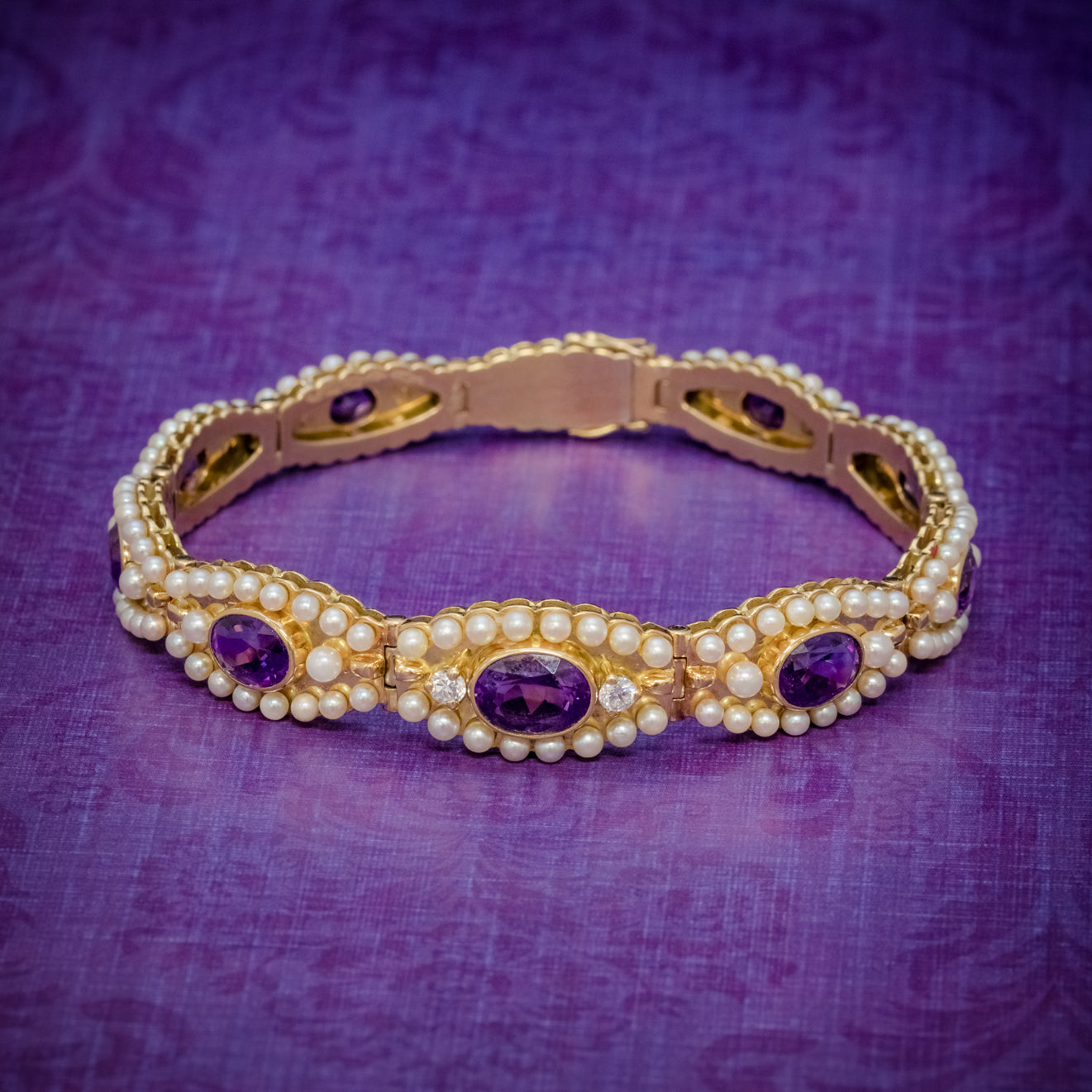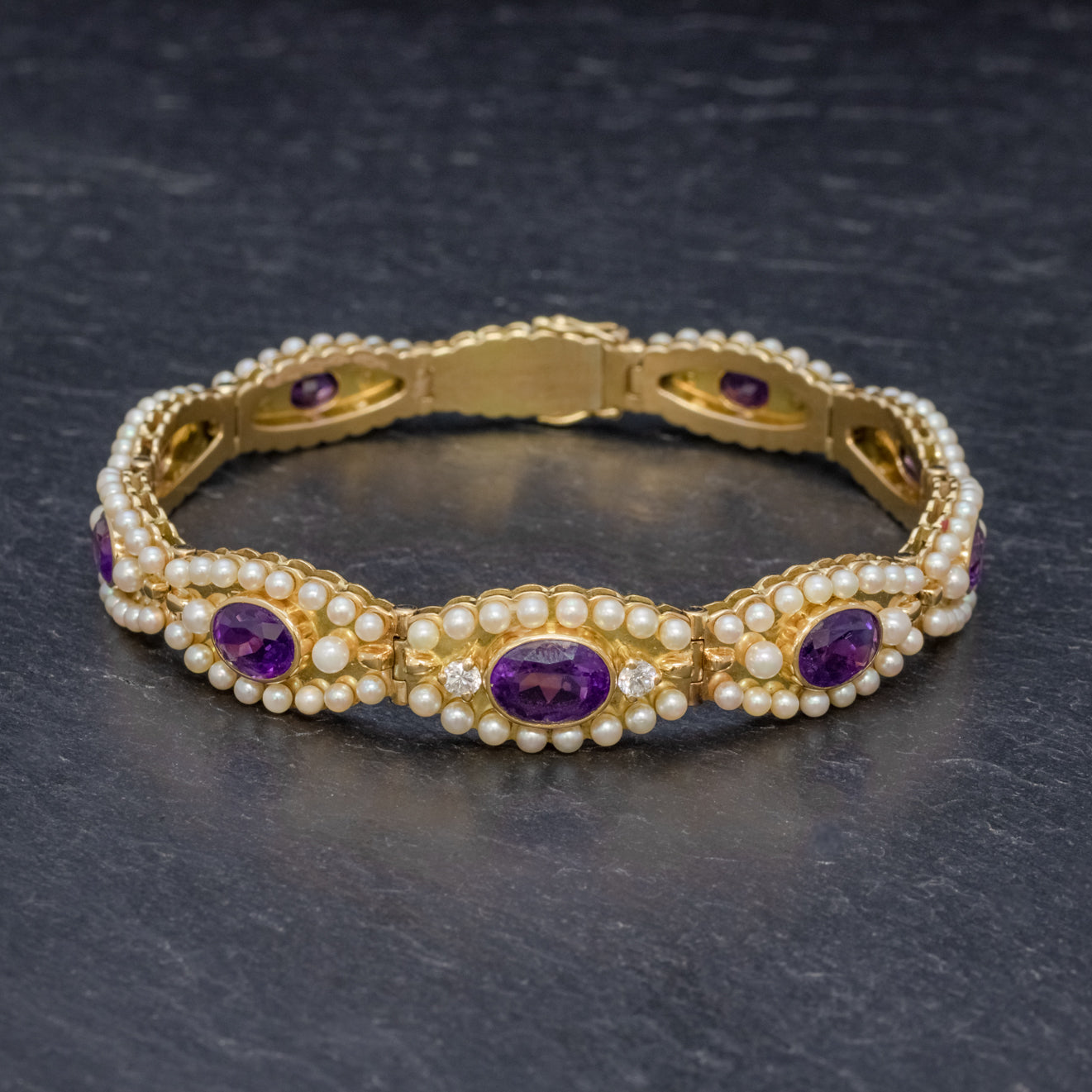 An outstanding antique French bracelet from the early 20th Century decorated with lustrous pearls and nine deep?purple amethysts. The?amethysts range from 0.30ct?at the back to a 2ct?stone at the front which is flanked by two sparkling 0.10ct diamonds.