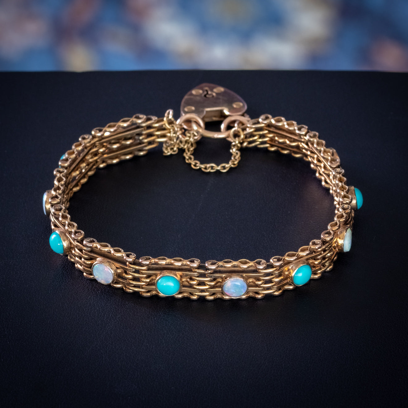 Antique Edwardian Opal Turquoise Gate Bracelet 9ct Gold Walker And Hall Circa 1901