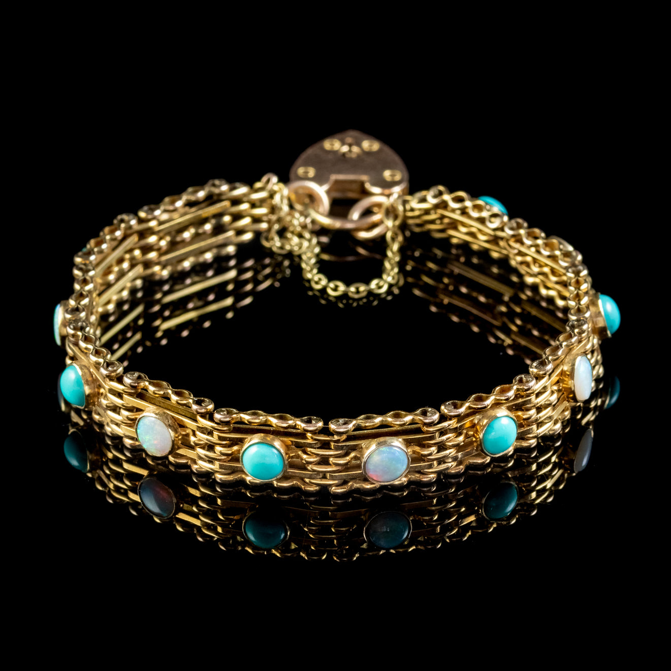 A beautiful Antique Edwardian gate bracelet made by Sheffield jewellers Walker & Hall at the turn of the 20th Century. The piece is made up of intricate 9ct Yellow Gold links dotted with colourful 0.50ct natural Opals and Turquoise stones.