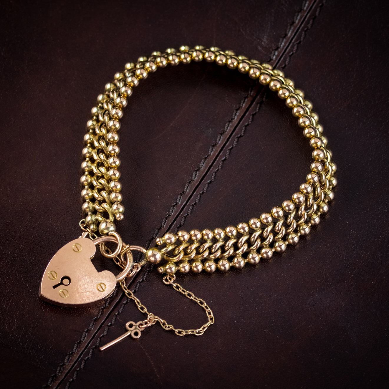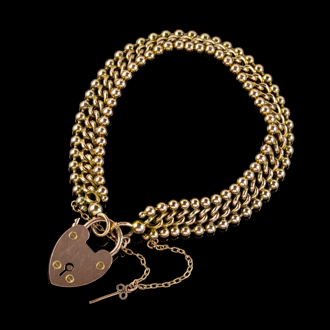 A delightful Antique Edwardian curb bracelet made up of solid 9ct Yellow Gold links and held securely by a safety chain and heart padlock clasp which is complete with a small key.