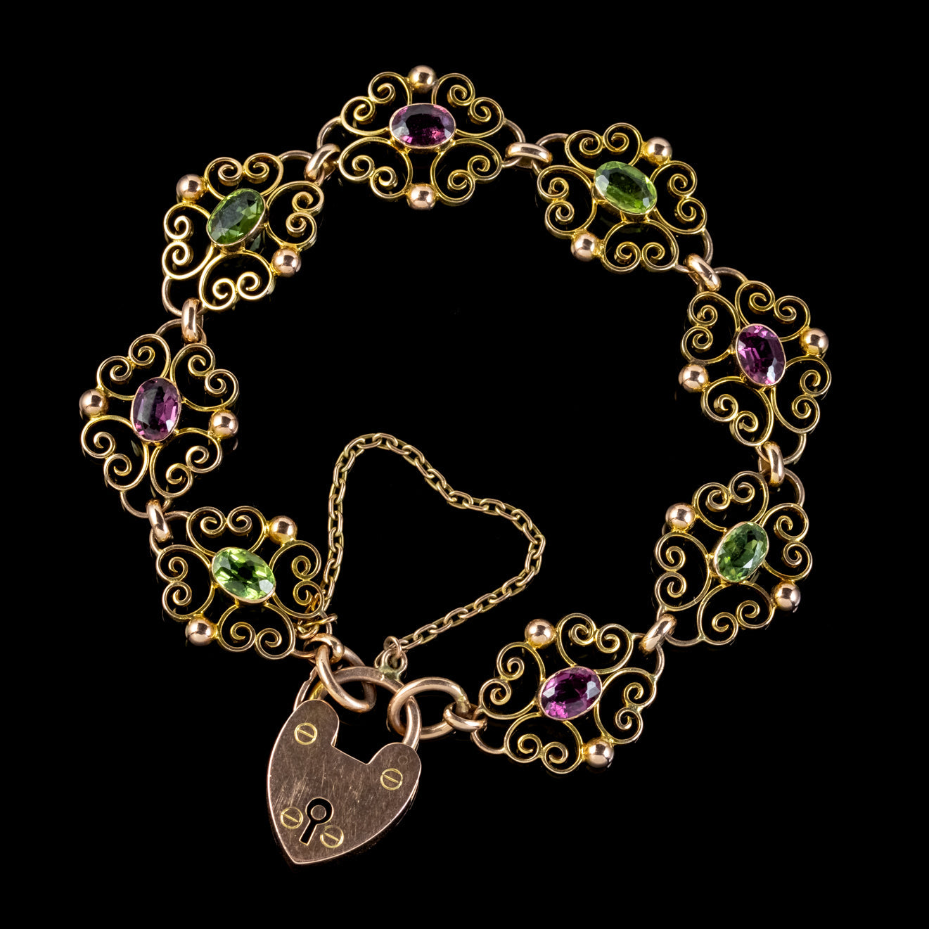 A fabulous Antique 9ct Yellow Gold bracelet from the early 20th Century made up of fancy scrolling links dotted with green Peridots and violet Almandine Garnets.