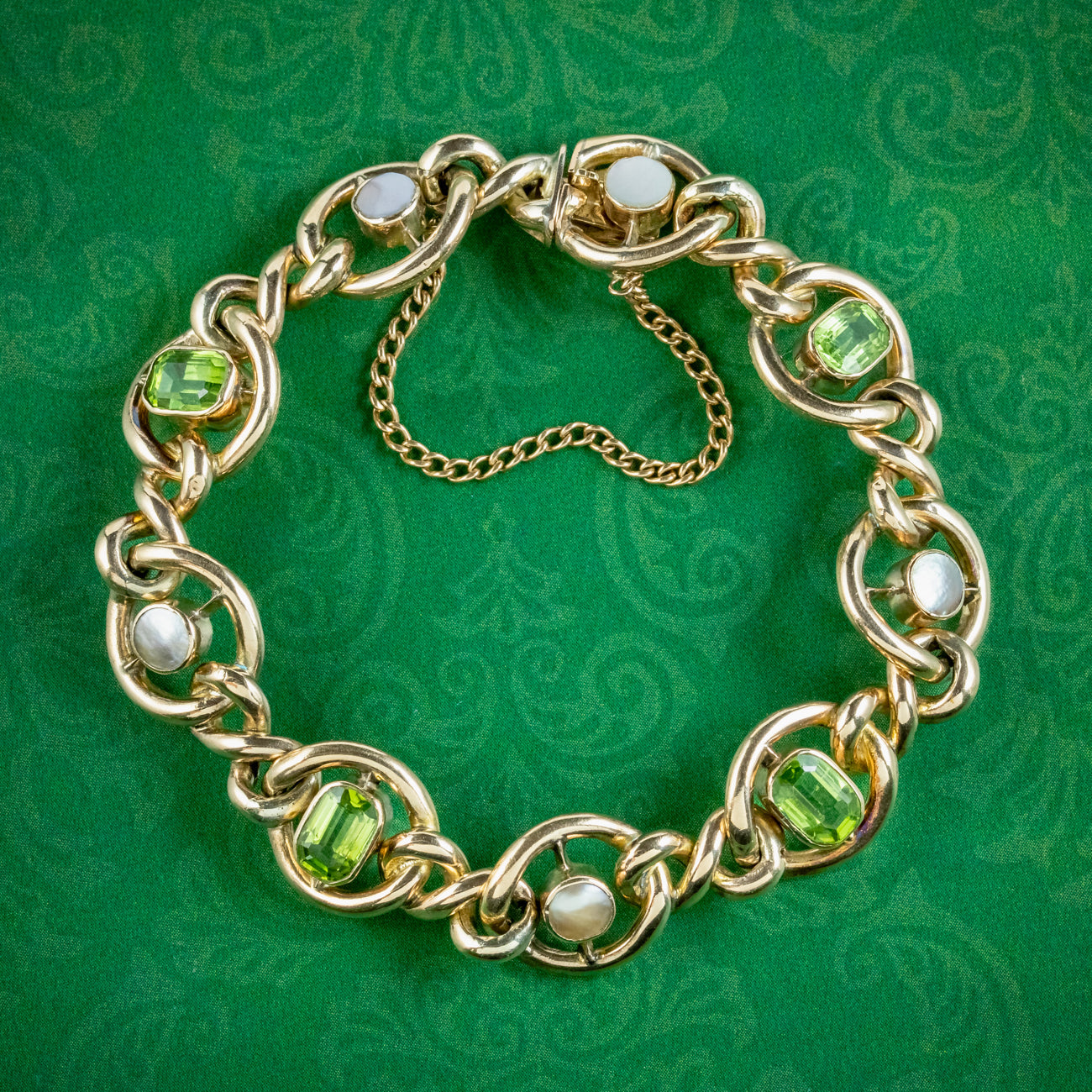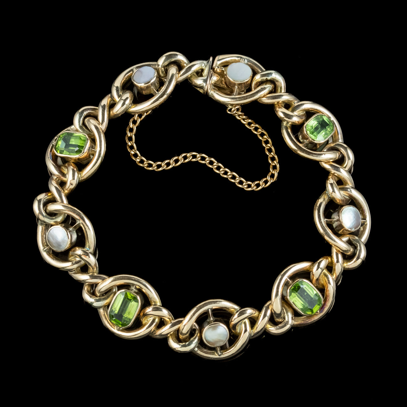 An attractive antique Edwardian curb bracelet fashioned in solid 9ct gold with four emerald cut peridots and four iridescent mabe pearls bezel set in the centre of each of the larger links.