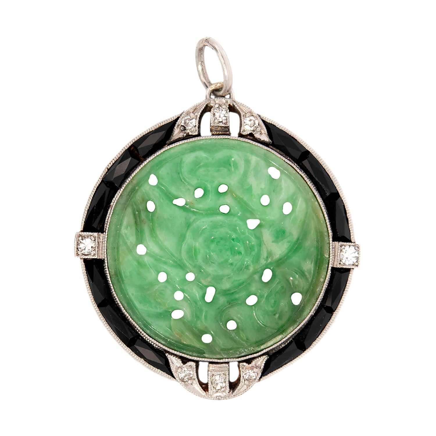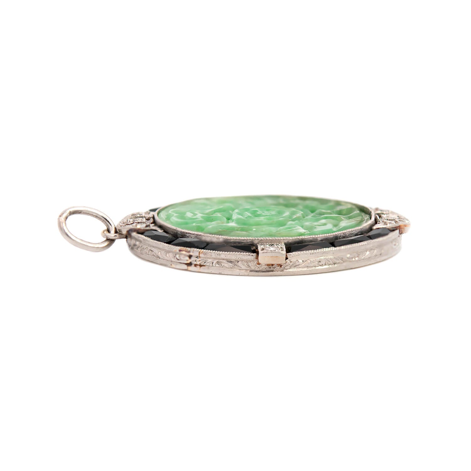 A lovely carved jade pendant from the Art Deco (ca1920) era! This striking pendant has a strong Deco look and is comprised of a?floral carved piece?of jade, which is set in a platinum?milgrain frame. The jade center is surrounded by another platinum setting containing French cut onyx stones and single cut diamonds bead set within the frame at north, east, south, and west on the pendant. The pendant also features elegant scrolling engraving all along the side and a simple round platinum jump ring at the bail. The piece has a fantastic Art Deco look and would make a wonderful addition to any collection!
