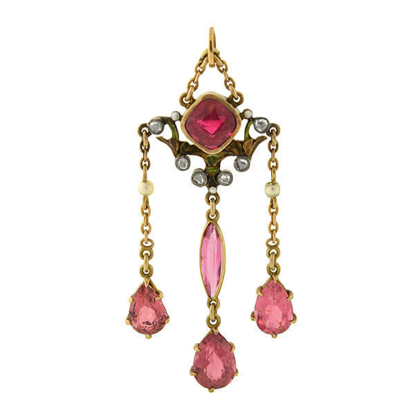 A gorgeous lavalier pendant from the Art Nouveau (ca1900) era! This lovely piece is made of 14kt gold, and has an elegant chandelier design. The pendant hangs from a thin gold chain at the top, which is threaded through a gold bail. At the center of the pendant is a faceted?bezel set tourmaline, which displays a?rich, vibrant pink color. Three strands of teardrop tourmalines dangle freely below the centerpiece, giving lovely movement to the design! Delicate natural seed pearls, sparkling rose cut accent diamonds, and green enamel details add further beauty to the artistic design. Suitable for daily wear or special occasions, this luscious pendant would look marvelous paired with a favorite gold chain!