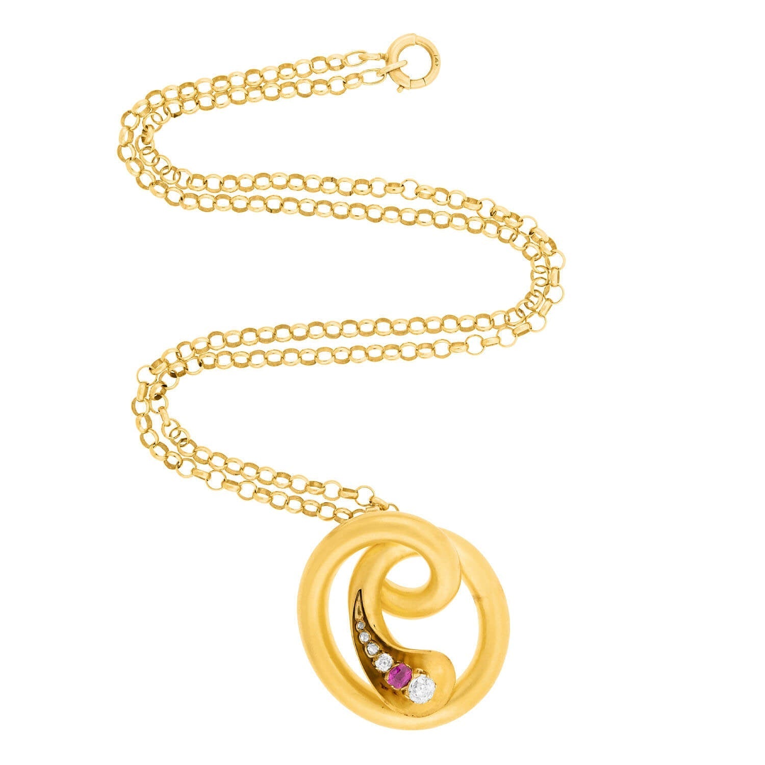 An artistic gold pendant from the Victorian (ca1880) era! This wonderful piece is made of vibrant 18kt yellow gold with a semi-matte finish and has a beautiful, curled 3-dimensional design. The pendant has the subtle appearance of a snake, whose body coils and loops to form a round pretzel-like shape with its head emerging at the center. A rose of five sparkling diamonds .80ctw and one luscious .40ctw ruby form a line down the snake's head, adding a perfect accent! Three of the diamonds are Rose Cuts in bezel settings; the other two are prong-set old Mine Cuts. Placed strategically on the back of the piece is a hidden gold bail, allowing the pendant to hang seamlessly from a simple gold rolo chain. A fabulous Victorian piece, it's perfect for any snake lover and would make a fantastic addition to any collection!