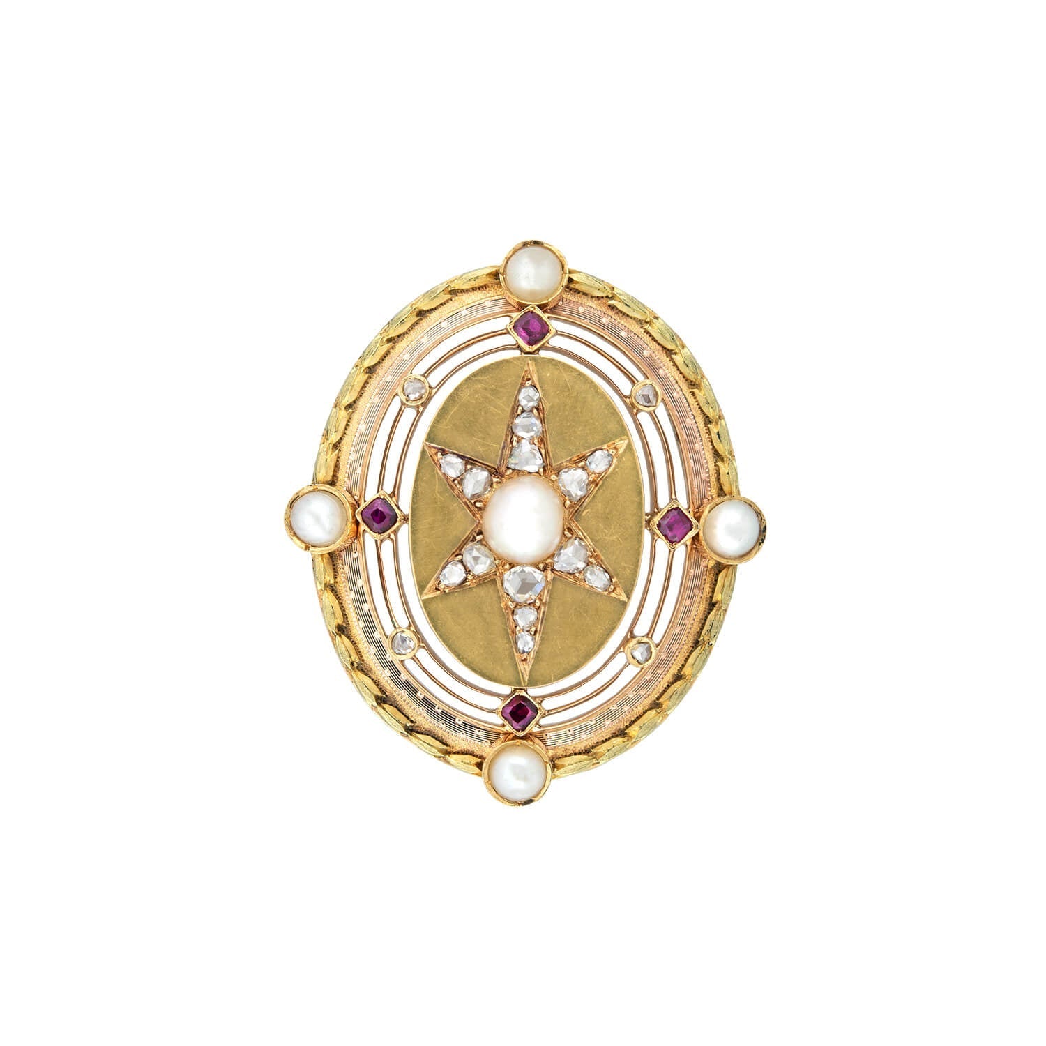 A gorgeous pendant from the Victorian (ca1880s) era! Crafted in vibrant 14kt yellow and rose gold, this piece displays a beautiful starburst design. Centering on a lustrous white pearl, glittering Rose Cut diamonds form the six arms of the star. The star rests atop a polished yellow gold oval which is encircled by?open wirework, decorated by four Square Cut rubies and four Rose Cut diamonds in bezel settings. Slightly smaller than the center pearl, four matching pearls adorn the pendant. A ring of engraved rose gold adds dimension below, perfectly complimenting the lush red rubies and the design is completed by a 3-dimensional tulip border in yellow gold. A double bail hides behind the top of the piece, ready to be worn on a favorite chain. A feminine and ornate?expression of a classic motif, this pendant would be perfect for any Victorian collection!