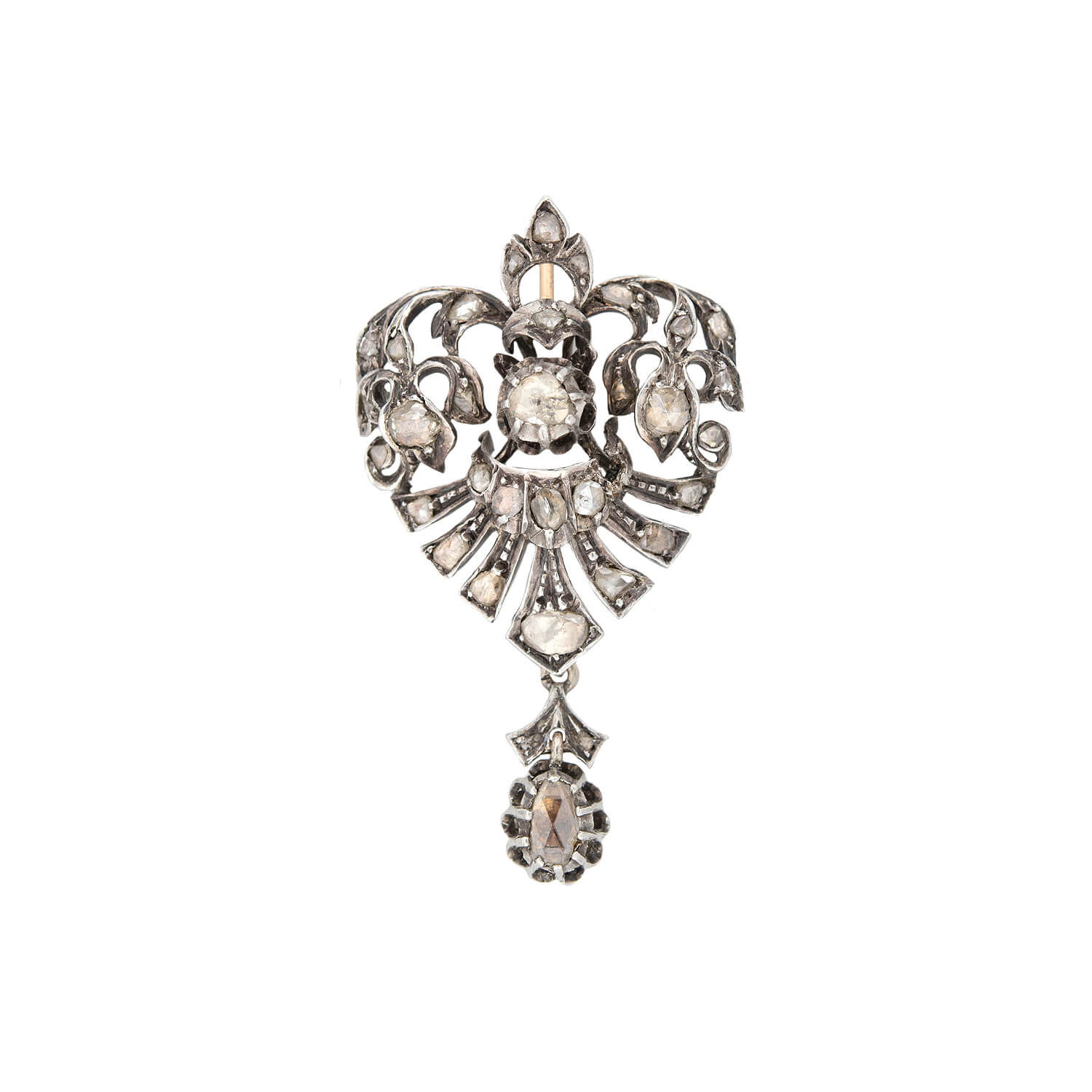 A lovely heart pendant from the Victorian (ca1880s) era! Crafted in 14kt yellow gold and topped in sterling silver, this heart-shaped pendant is encrusted with Rose Cut diamonds that gently glisten as they catch the light. A larger Rose Cut diamond hangs below within a collet setting, swinging freely. Originally worn as a pin, the pendant has a?hidden bail behind the top of the heart, ready to hang from a favorite chain. A beautiful example of Victorian-era jewelry, this heart would be an elegant addition to any collection!