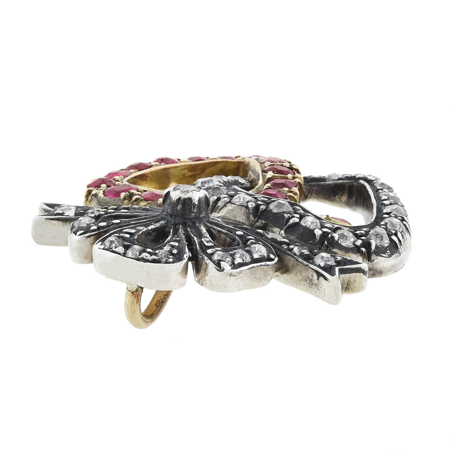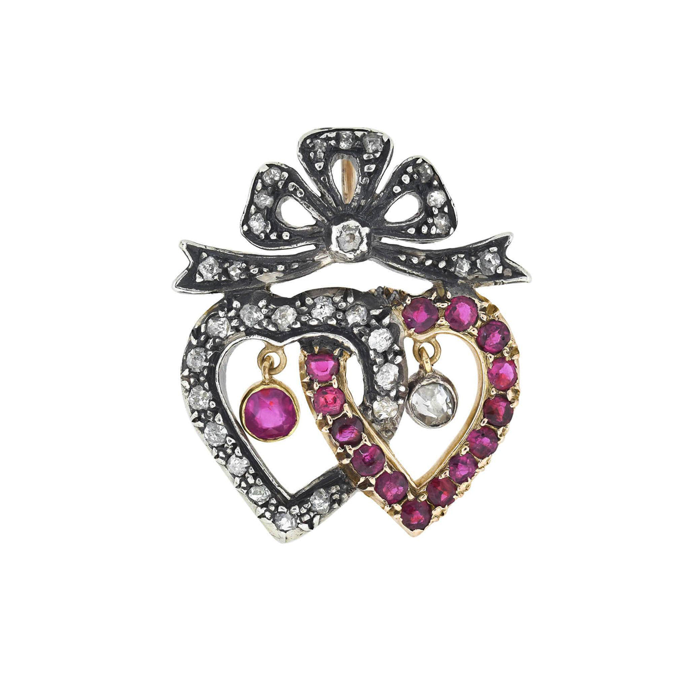 An absolutely exquisite diamond and ruby pendant?from the Victorian (ca1880s) era! This breathtaking piece is crafted in sterling silver topped 15kt rose gold and displays a gorgeous and romantic design. Two overlapping heart motifs rest at the center, below a feminine bow surmount. The bow and one of the hearts are both topped in sterling silver and adorned with sparkling old Mine Cut diamonds, each one catching the light beautifully with every turn. The other heart is crafted in rose gold, creating a fantastic mixed metals appeal, and is encrusted with raspberry red faceted rubies. Dangling from the center of each heart is a singular diamond and ruby, both resting in an open back bezel frame, adding wonderful movement to the design. Finishing the piece is a hidden bail at the back, perfect for adding this stunning Victorian pendant to a favorite chain. A very unusual and special design, this romantic?pendant?would make a wonderful addition to any collection!