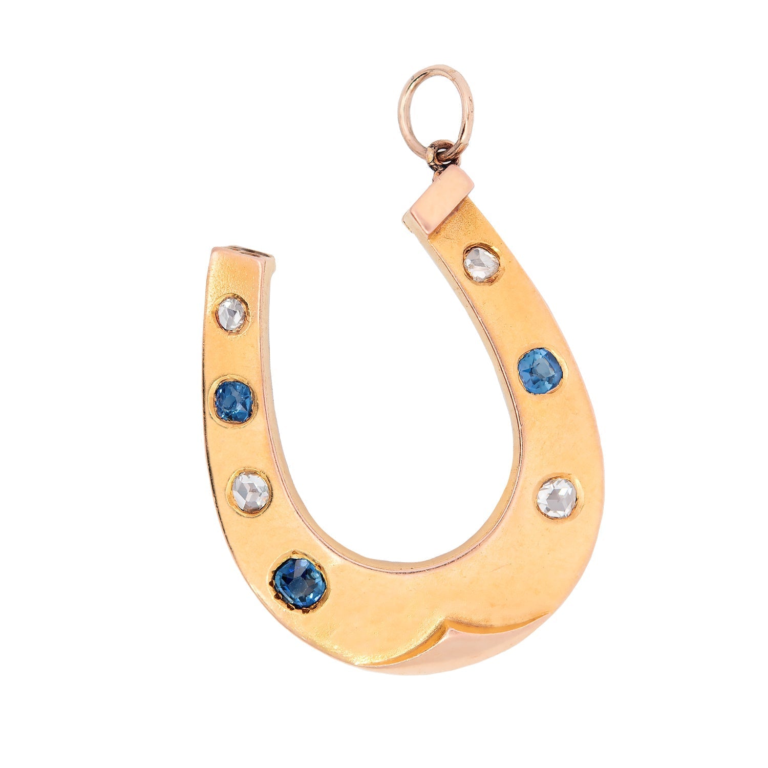 A fabulous gold horseshoe pendant from the Victorian (ca1880) era!?This gorgeous piece is crafted in 18k yellow gold and features 7 alternating gemstones. The horseshoe holds four?Rose Cut diamonds, weighing approximately .25ctw. The three?sapphires?are a bright blue hue and collectively weigh approximately 60ctw. The horseshoe has a smooth finish and simple overall design.?The placement of the bail at the top right of the piece allows the horseshoe to hang at an angle, giving the pendant an eye-catching look when worn. A very attractive and lightweight piece, it would look lovely worn alone on a chain or worn as a charm on a bracelet. Perfect for the equestrian enthusiast, it would make a fantastic addition to any jewelry collection!