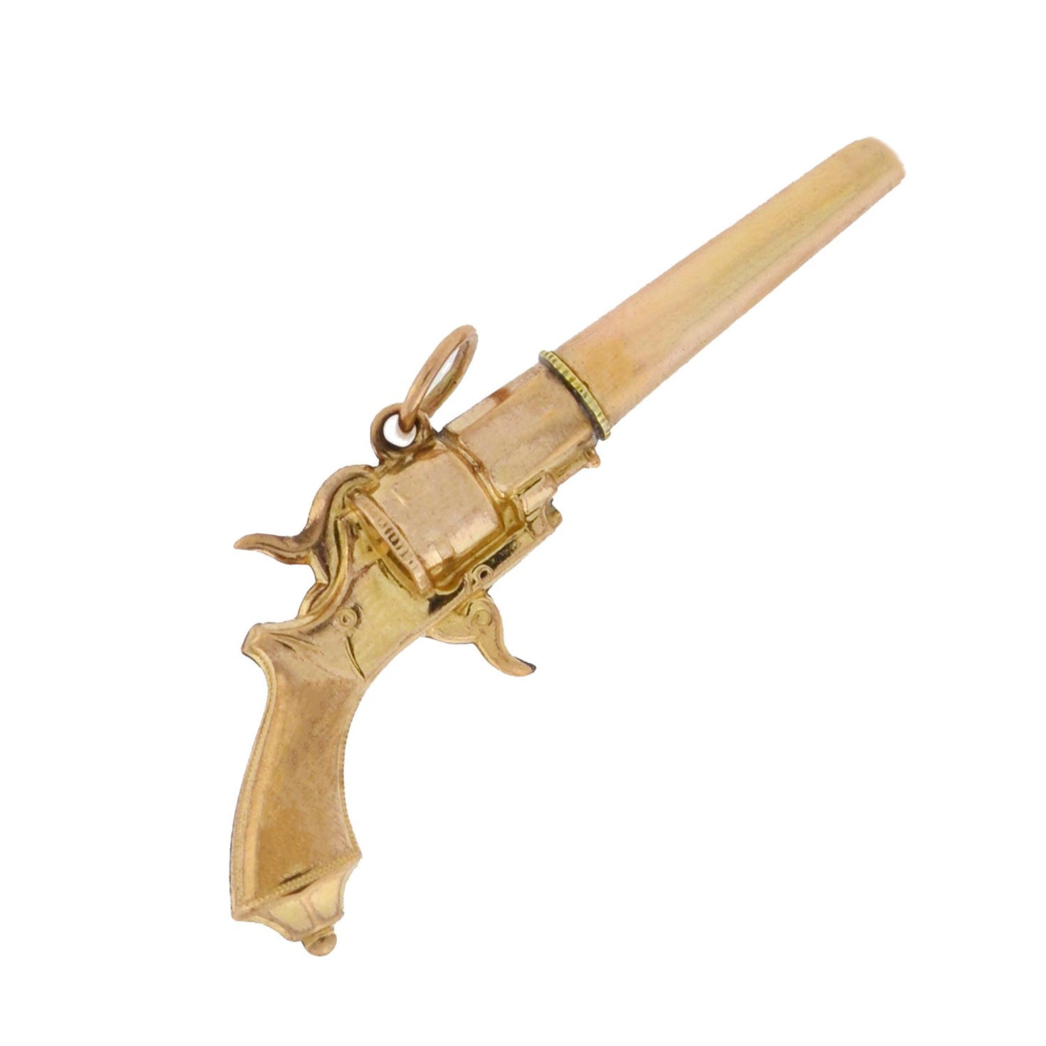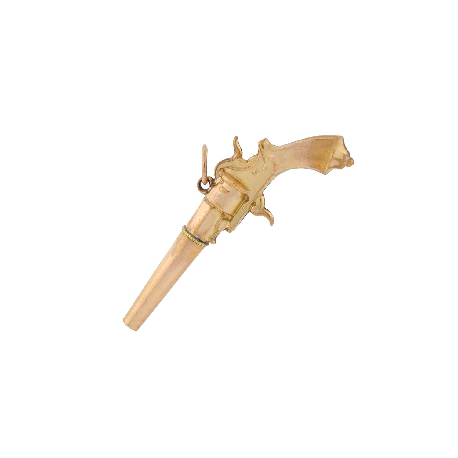 A fantastic and unusual watch key?pendant from the Victorian (ca1880) era! Crafted in 9kt yellow gold, this 3-dimensional piece forms the shape of a realistic looking?pistol. Fantastic carved details include a grip,?hammer, cylinder, trigger, and an elongated barrel featuring the watch key opening at the end. Milgrained work and etched screw heads add wonderful textural details to the smoothly polished piece and the pendant?hangs?on an angle from a simple gold bail at the top, perfect for adding to?a favorite chain. A gorgeous and unique piece, it would make a fabulous addition to any collection!