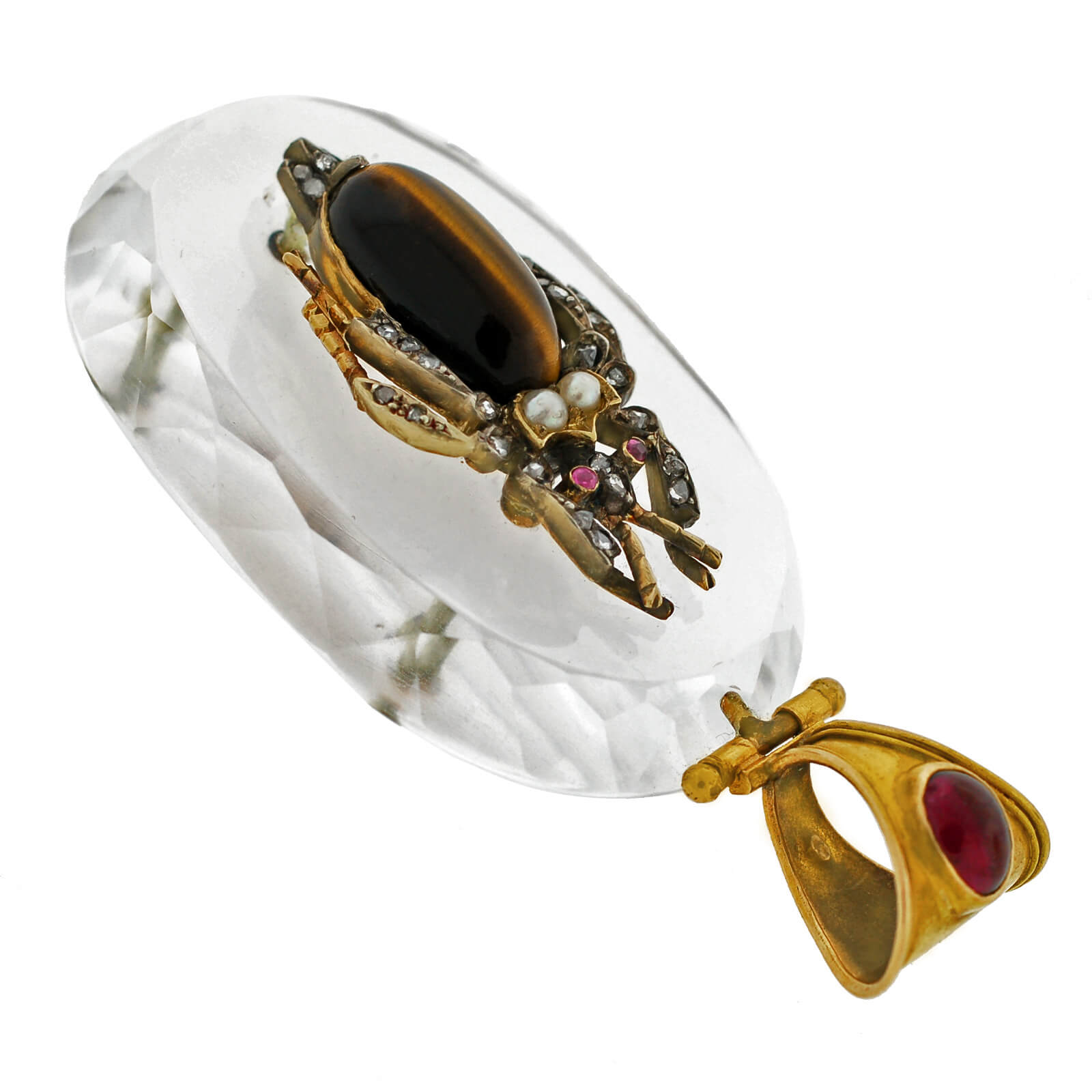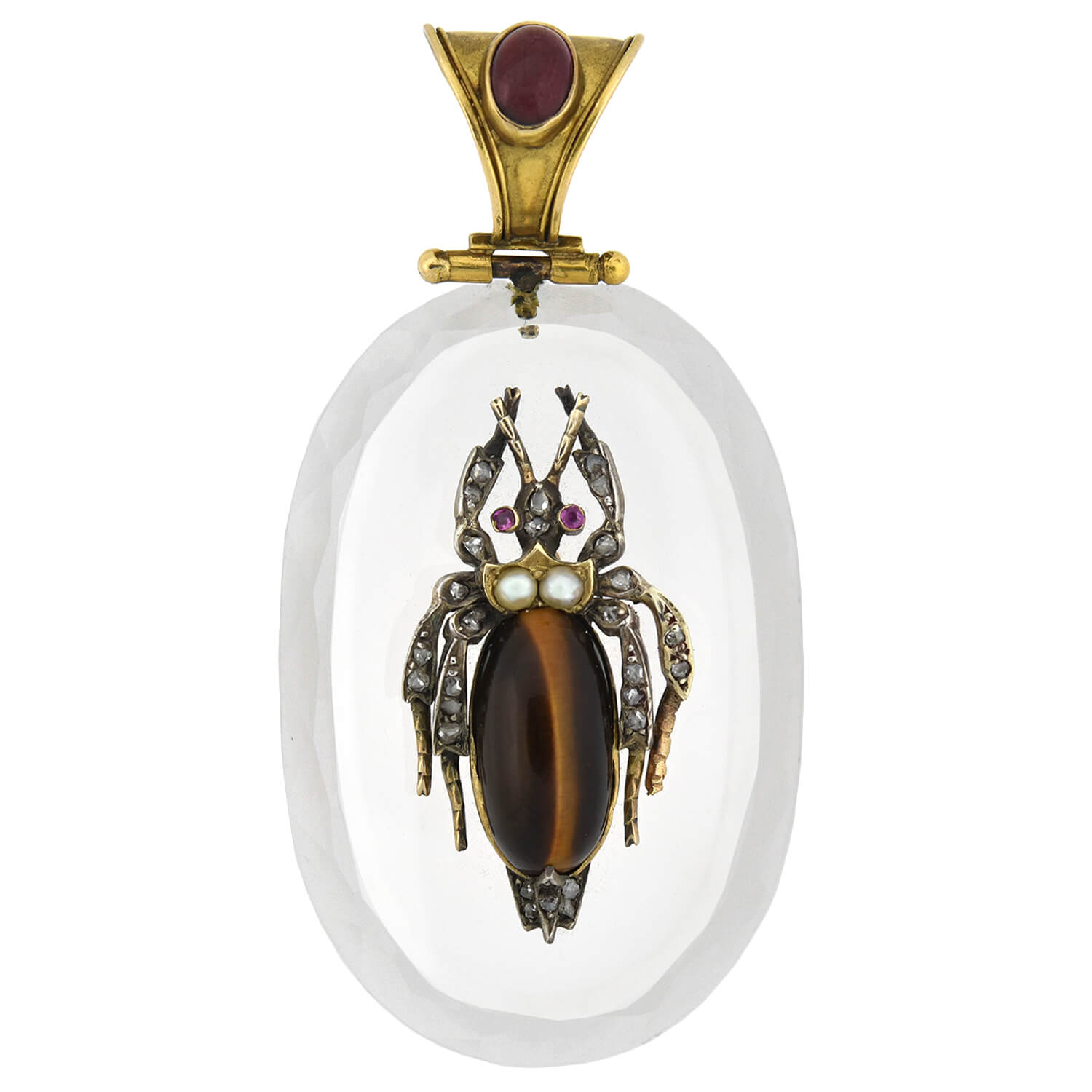 Victorian Large 18kt Rock Crystal, Diamond, Garnet + Tiger Eye Bug Pendant